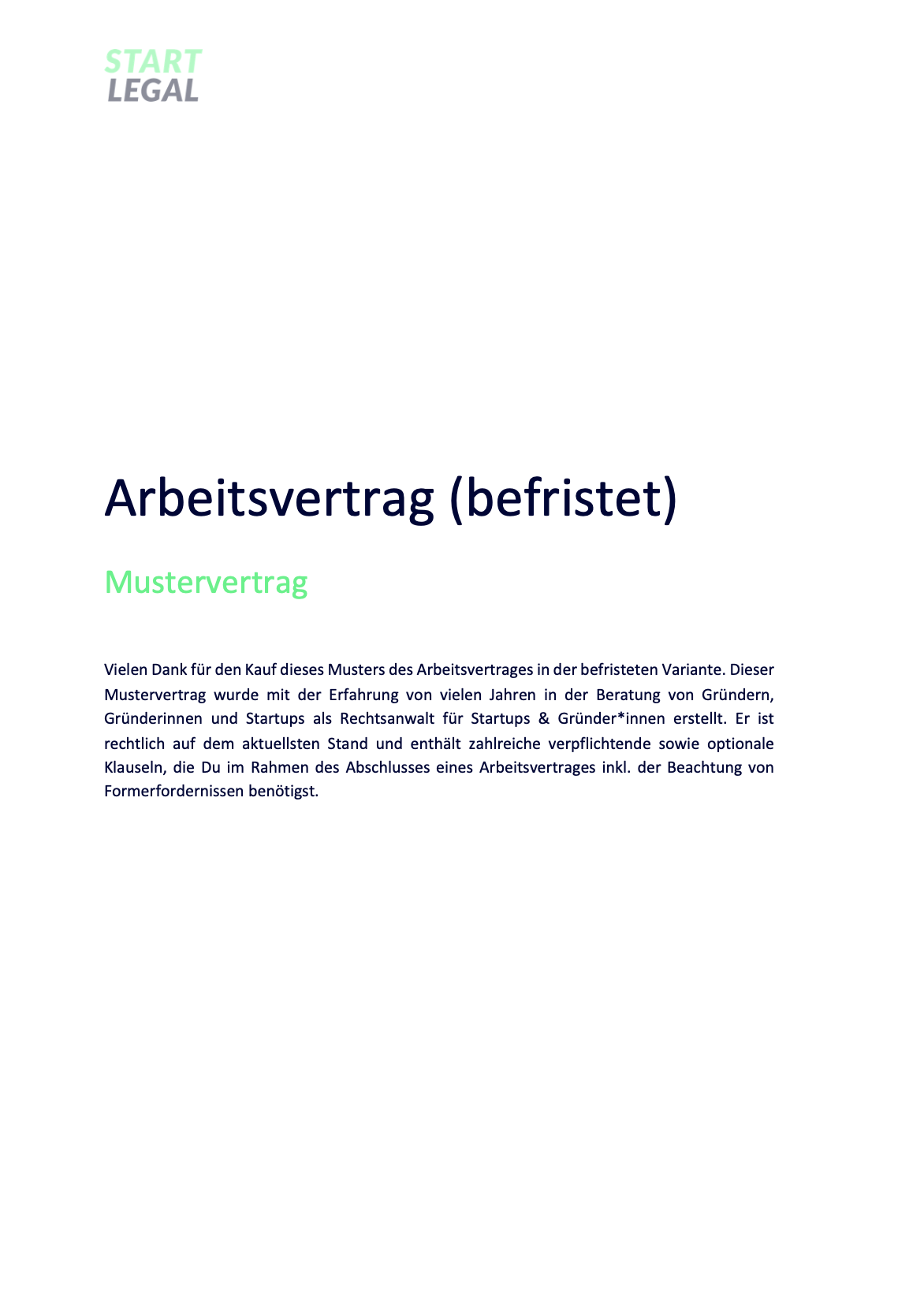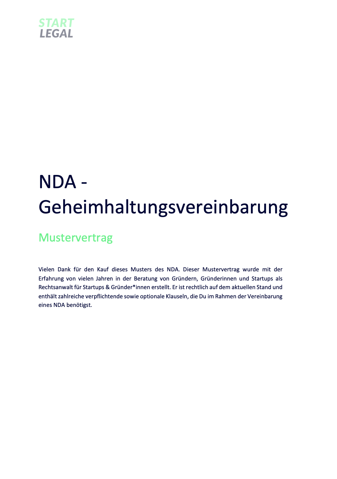 Auf START LEGAL findest Du Musterverträge, die von erfahrenen Rechtsanwält*innen für Startups & Gründer*innen erstellt wurden. Verständlich, rechtssicher und einfach auszufüllen.